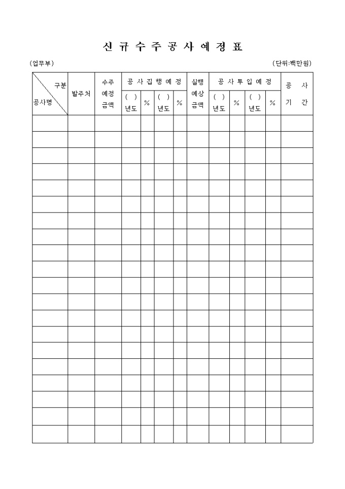 9,000원/월신규수주공사예정표 입니다. 발주처, 수주예정금액, 공사집행예정, 실행예상금액, 공사투입예정등의 세부 항목으로 구성된 양식입니다.