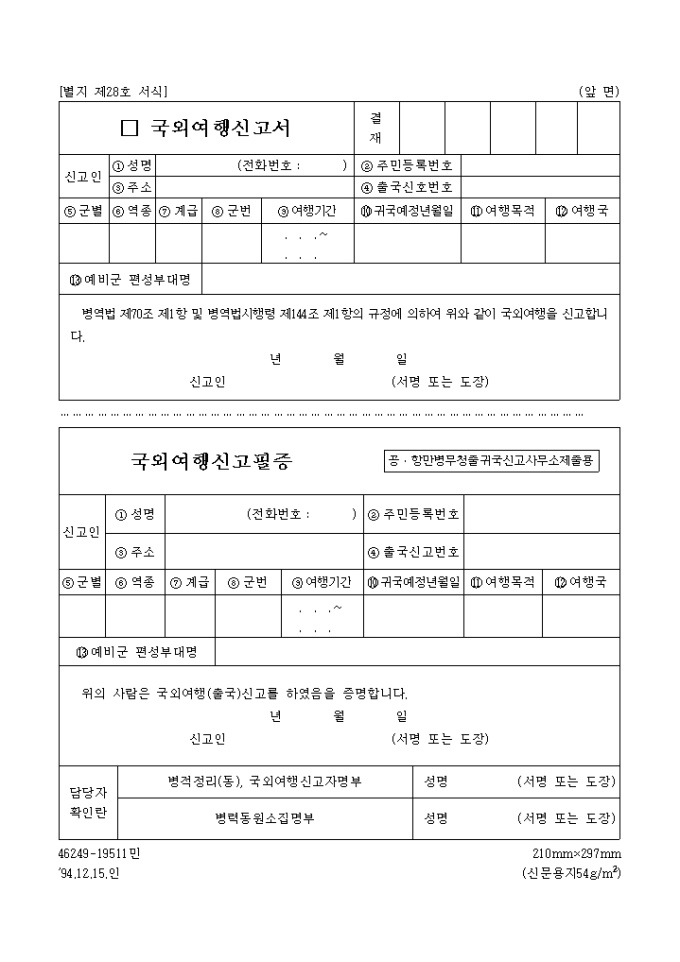 병역법 제70조 제1항 및 병역법시행령 제144조 제1항의 규정에 의하여 위와 같이 국외여행을 신고할 때 사용하는 국외여행 신고서 양식입니다.