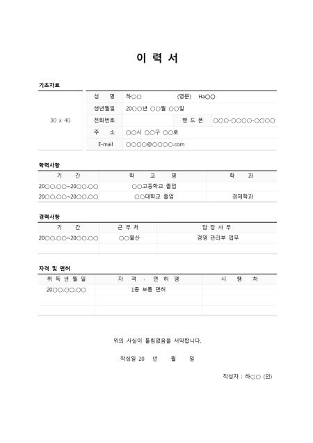 기본 템플릿이 제공되어 처음 이력서를 작성하는 사람도 쉽게 완성할 수 있는 사용자 친화적 구조입니다.