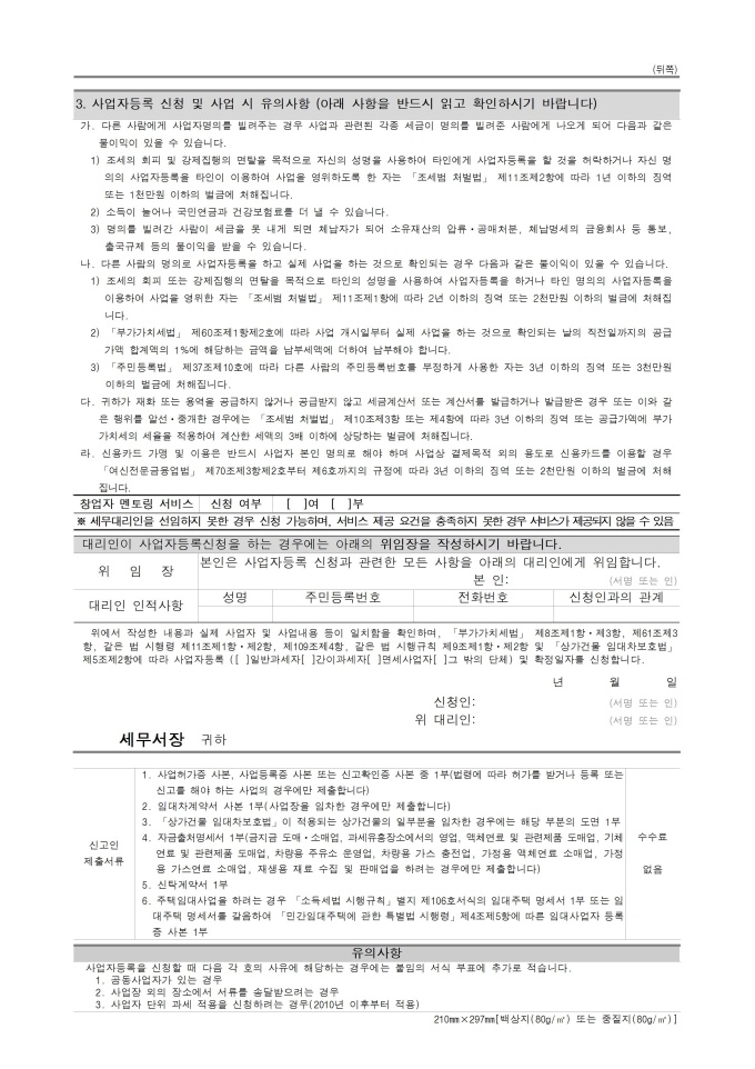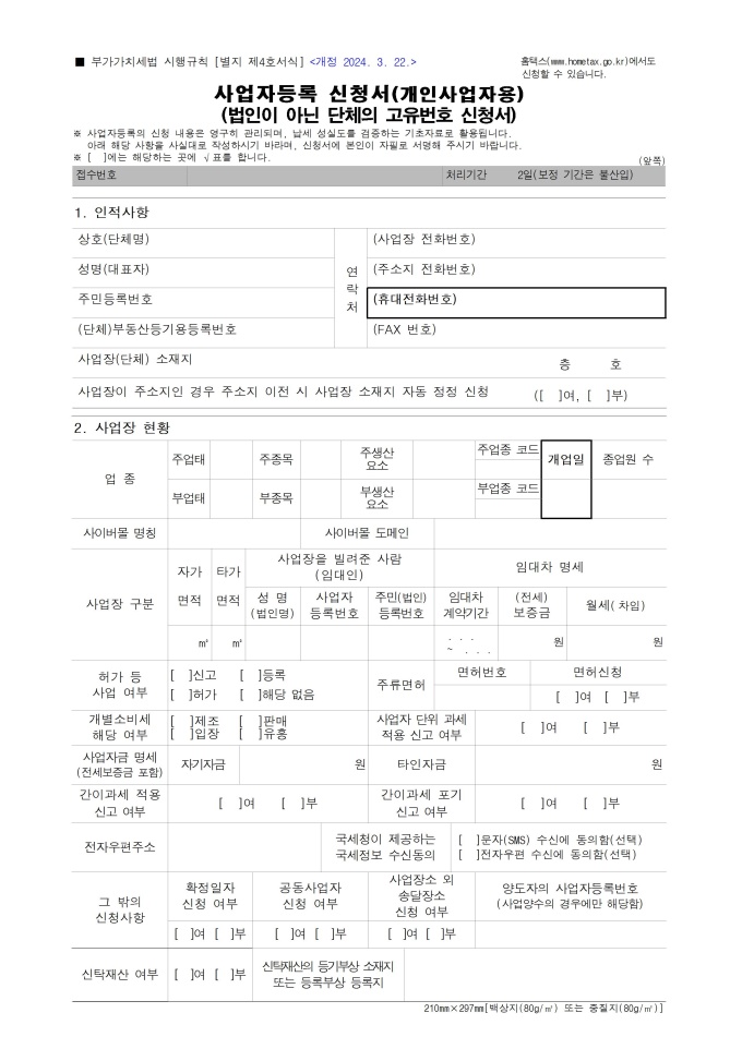 9,000원/월사업자등록 신청서(개인사업자용)(법인이 아닌 단체의 고유번호 신청서) 서식입니다. 부가가치세법 시행규칙 [별지 제4호서식]