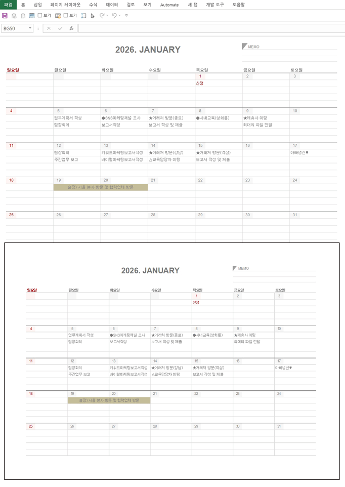 2026년 달력(월별일정,기념일,업무관리) 서식입니다. 2026년 엑셀 달력 서식은 월별 일정을 체계적으로 정리할 수 있도록 돕고, 중요한 기념일들을 쉽게 표시하여 개인적인 이벤트 관리를 용이하게 합니다. 이와 더불어 업무 관련 일정을 효율적으로 기록하고 추적할 수 있는 기능을 제공하여, 개인 생활과 직업 활동 모두에서 완벽한 균형과 관리를 지원합니다.