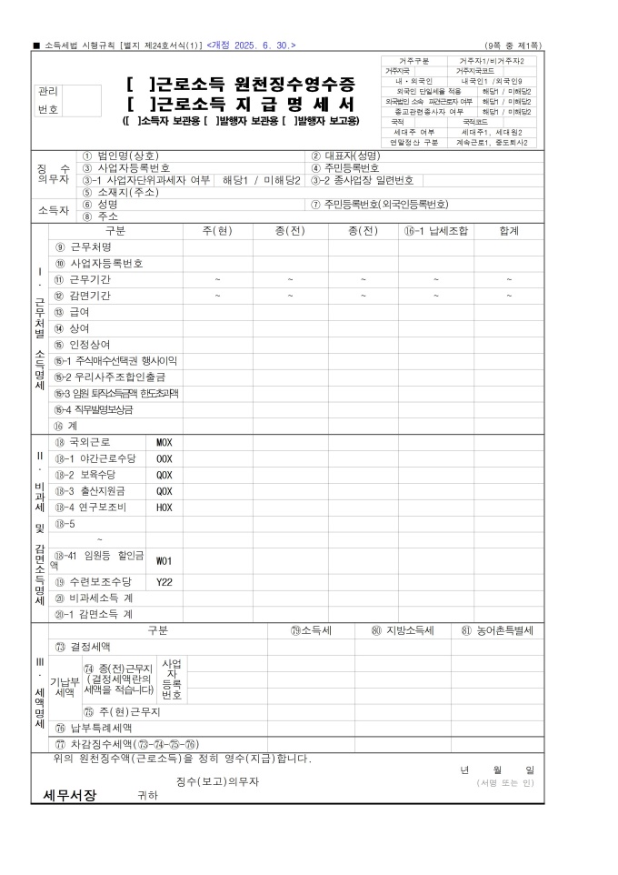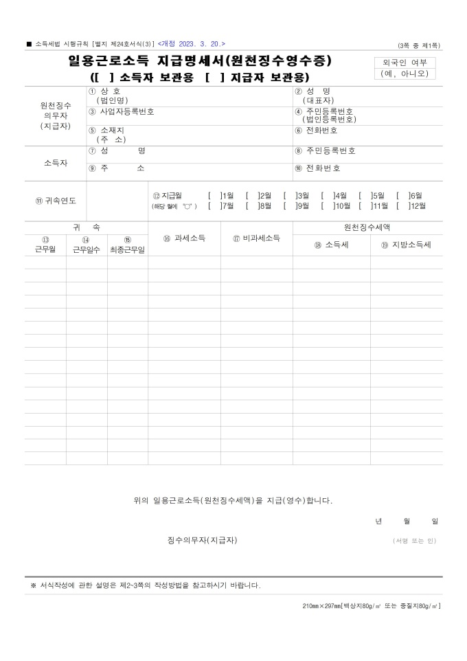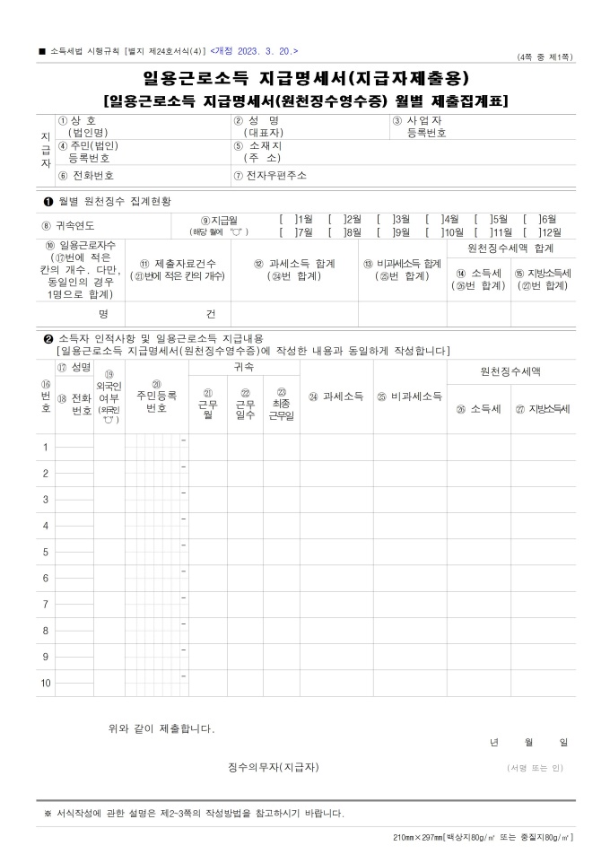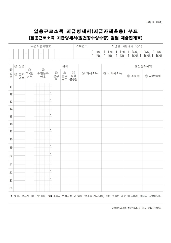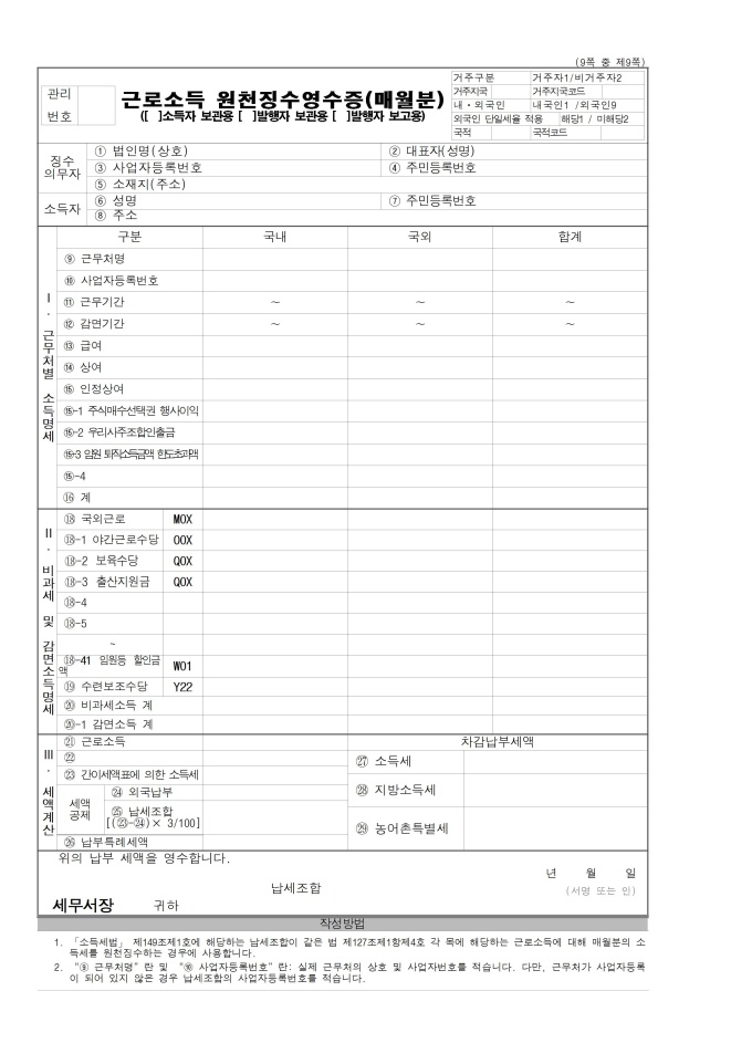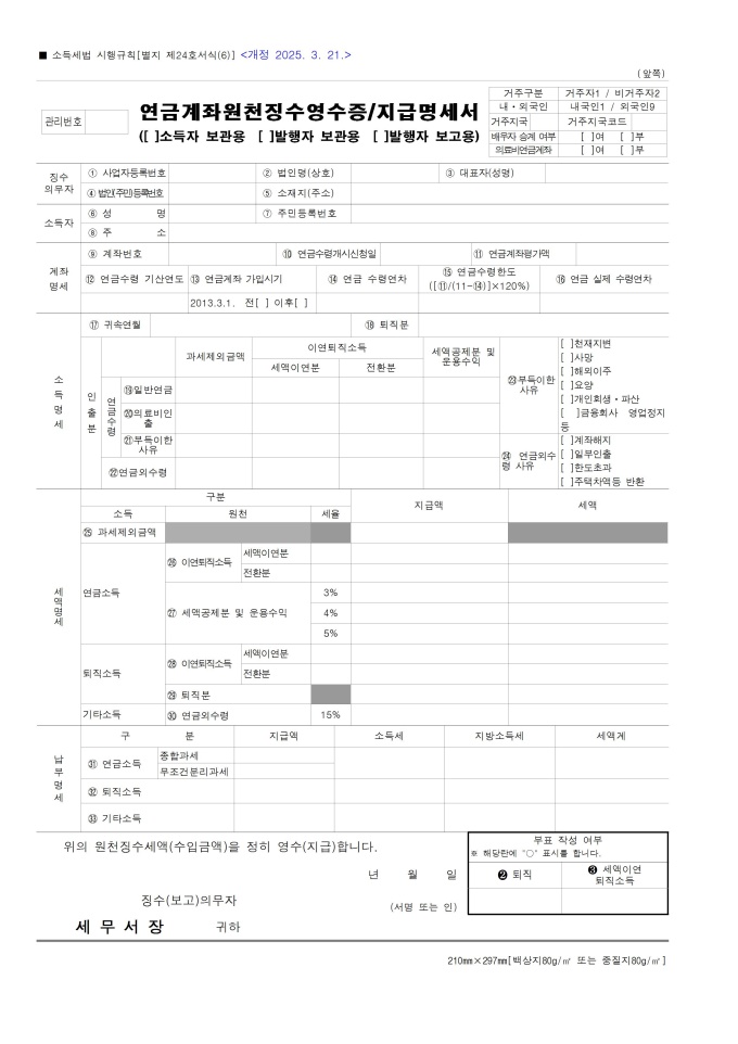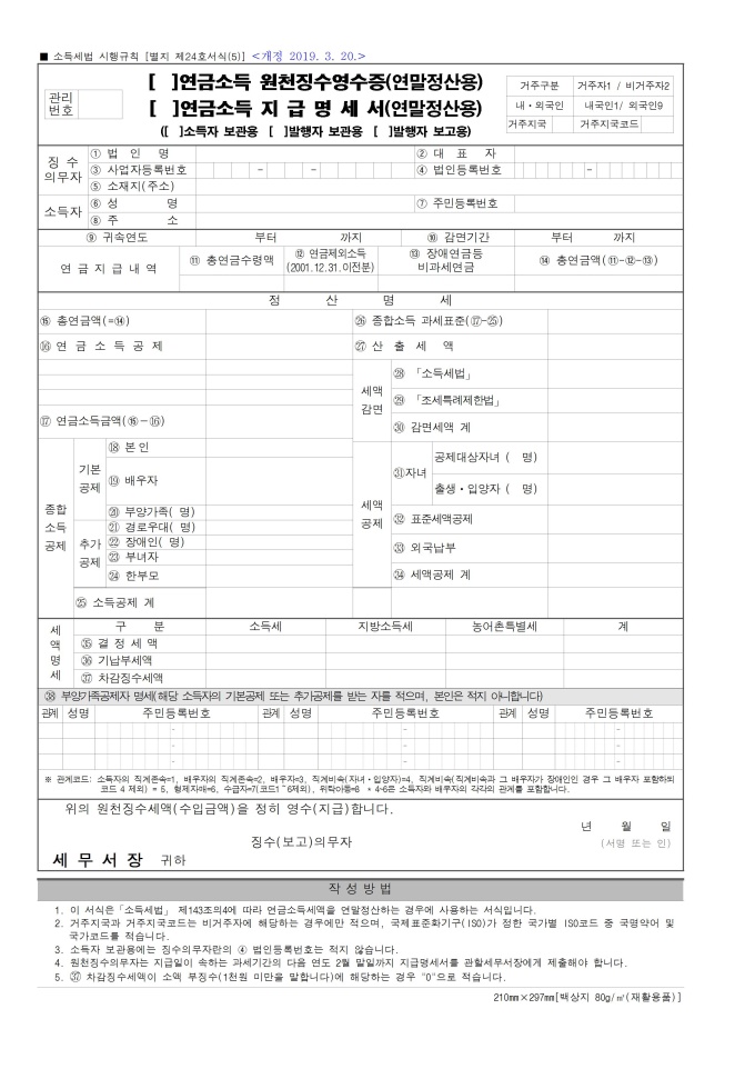 9,000원/월근로소득 원천징수영수증, 근로소득 지급명세서, 퇴직소득원천징수영수증_지급명세서, 일용근로소득 지급명세서(원천징수영수증), 일용근로소득 지급명세서, 연금소득 원천징수영수증(연말정산용), 연금소득 지급명세서(연말정산용) 서식입니다. 소득세법 시행규칙 [별지 제24호서식(1)]