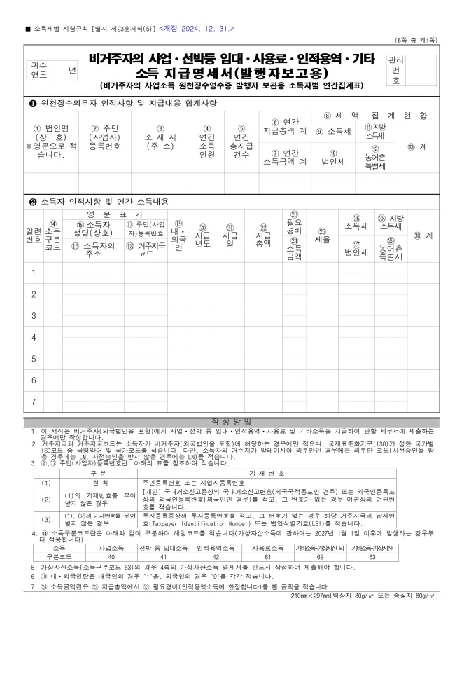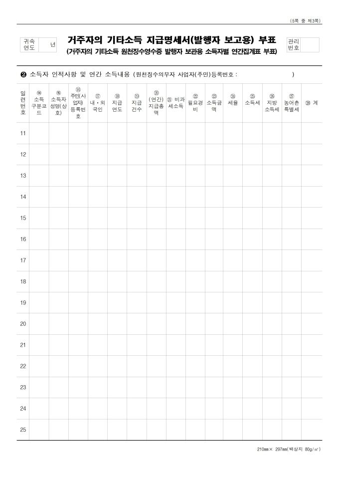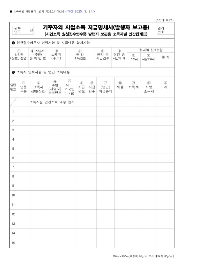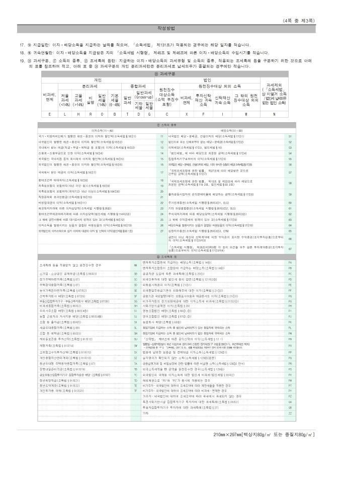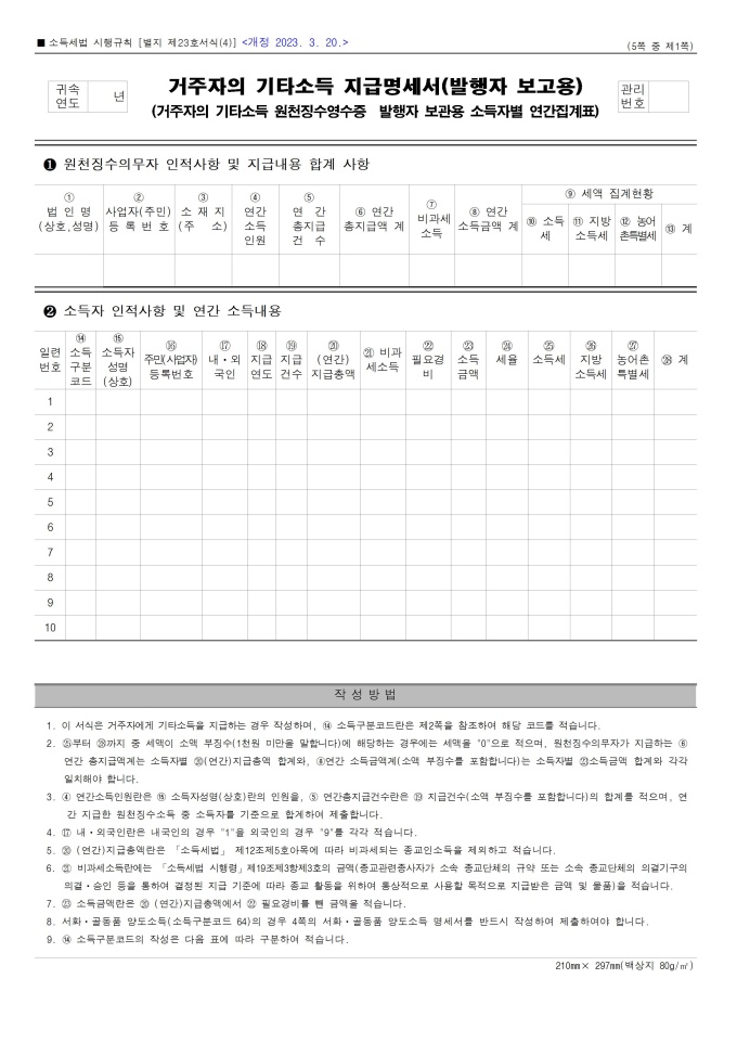 [서식 23] [이자ㆍ배당소득 원천징수영수증, 이자ㆍ배당소득 지급명세서(소득자 보관용, 발행자 보관용, 발행자 보고용)], 거주자의 사업소득 지급명세서(발행자 보고용), [사업소득 원천징수영수증(연말정산용), 사업소득 지급명세서(연말정산용)(소득자 보관용, 발행자 보관용, 발행자 보고용)], 거주자의 기타소득 지급명세서(발행자 보고용), 비거주자의 사업·선박등 임대·사용료·인적용역·기타소득 지급명세서(발행자보고용), [종교인소득 원천징수영수증(연말정산용), 종교인소득 지급명세서(연말정산용)(소득자 보관용, 발행자 보관용, 발행자 보고용)] 서식입니다.