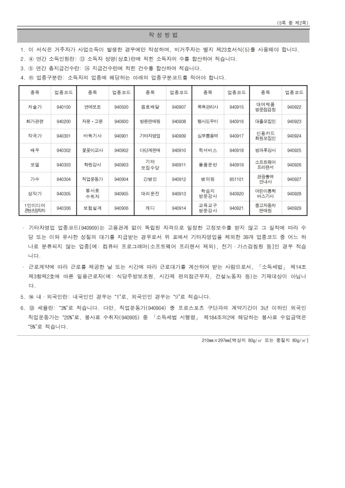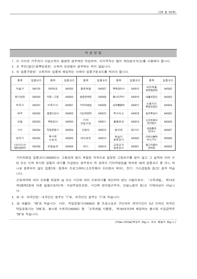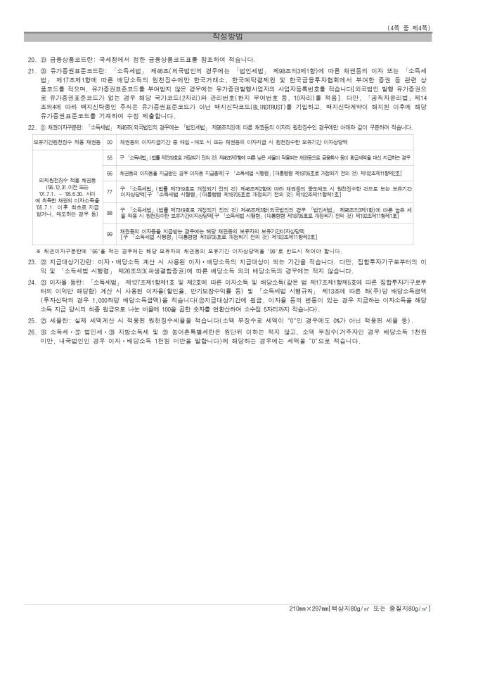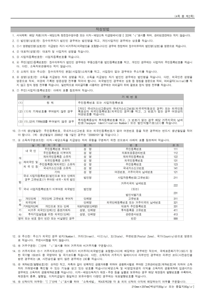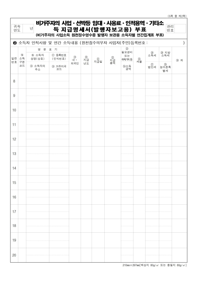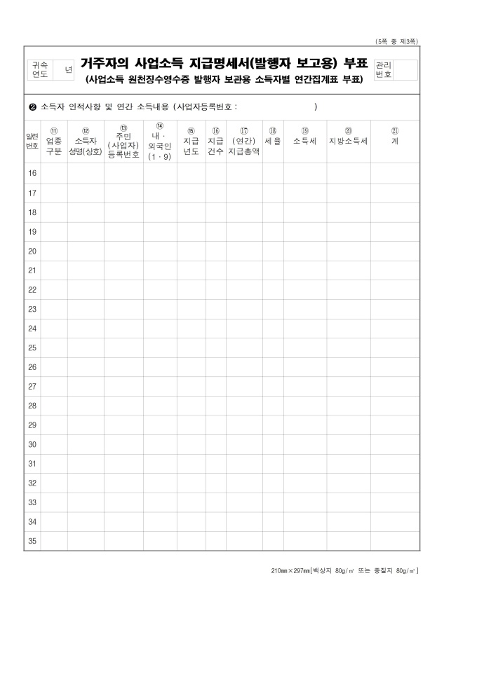 [서식 23] [이자ㆍ배당소득 원천징수영수증, 이자ㆍ배당소득 지급명세서(소득자 보관용, 발행자 보관용, 발행자 보고용)], 거주자의 사업소득 지급명세서(발행자 보고용), [사업소득 원천징수영수증(연말정산용), 사업소득 지급명세서(연말정산용)(소득자 보관용, 발행자 보관용, 발행자 보고용)], 거주자의 기타소득 지급명세서(발행자 보고용), 비거주자의 사업·선박등 임대·사용료·인적용역·기타소득 지급명세서(발행자보고용), [종교인소득 원천징수영수증(연말정산용), 종교인소득 지급명세서(연말정산용)(소득자 보관용, 발행자 보관용, 발행자 보고용)] 서식입니다.