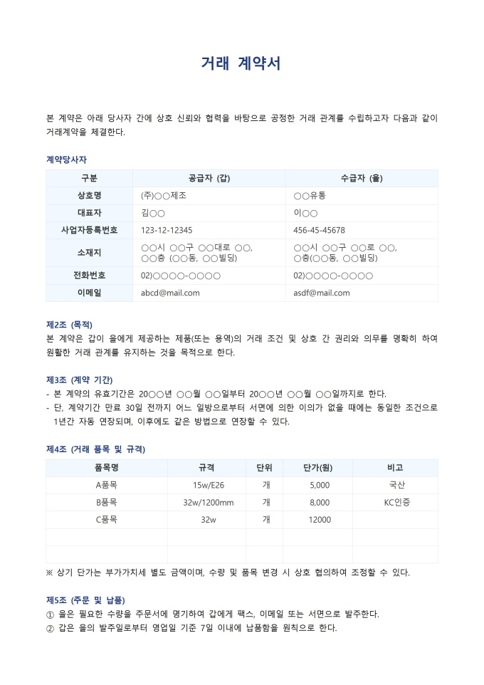 9,000원/월거래 계약서 서식입니다. 거래 계약서는 거래 당사자들이 특정 재산권이나 용역 등을 교환하기로 합의하고, 그 내용과 조건을 명확히 문서화하여 상호 간의 권리와 의무를 규정하는 서식입니다. 이는 구두 합의만으로는 불충분할 수 있는 복잡한 거래에서 분쟁의 소지를 줄이고, 약속의 이행을 강제하는 구속력 있는 증거가 됩니다.