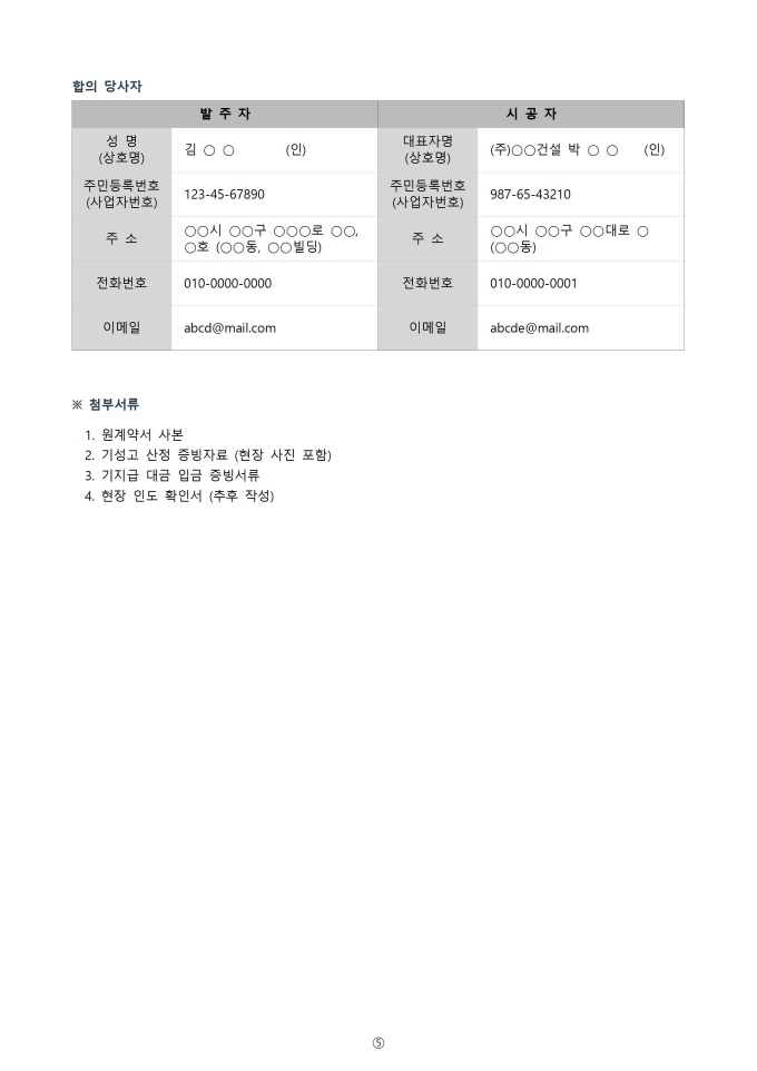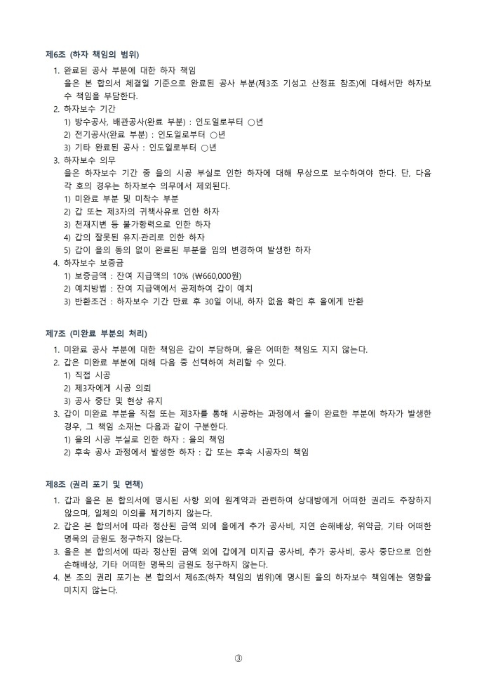 9,000원/월공사 타절 합의서 서식입니다. 공사 타절 합의서는 진행 중인 공사를 중단하기로 양측이 합의한 내용을 공식적으로 기록하는 문서입니다. 이 합의서에는 공사 중단의 사유, 중단 시점, 미완료 부분의 처리, 합의 당사자의 권리와 의무 등을 명확히 명시하여 분쟁을 예방하고 원만한 해결을 도모하는 역할을 합니다.