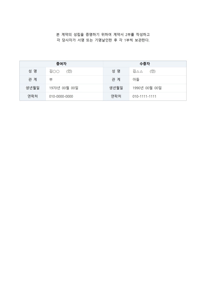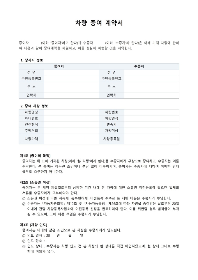 차량 증여 계약서 서식입니다. 차량 증여 계약서는 차량 소유자가 다른 사람에게 차량을 무상으로 이전하는 사실과 그 조건을 명확하게 기록하는 계약서입니다. 이 계약서는 증여자와 증여받는 자의 인적사항, 차량 정보를 포함하며, 증여의 목적과 인도 일자, 부대 비용 부담 등 중요한 내용을 구체적으로 명시합니다.