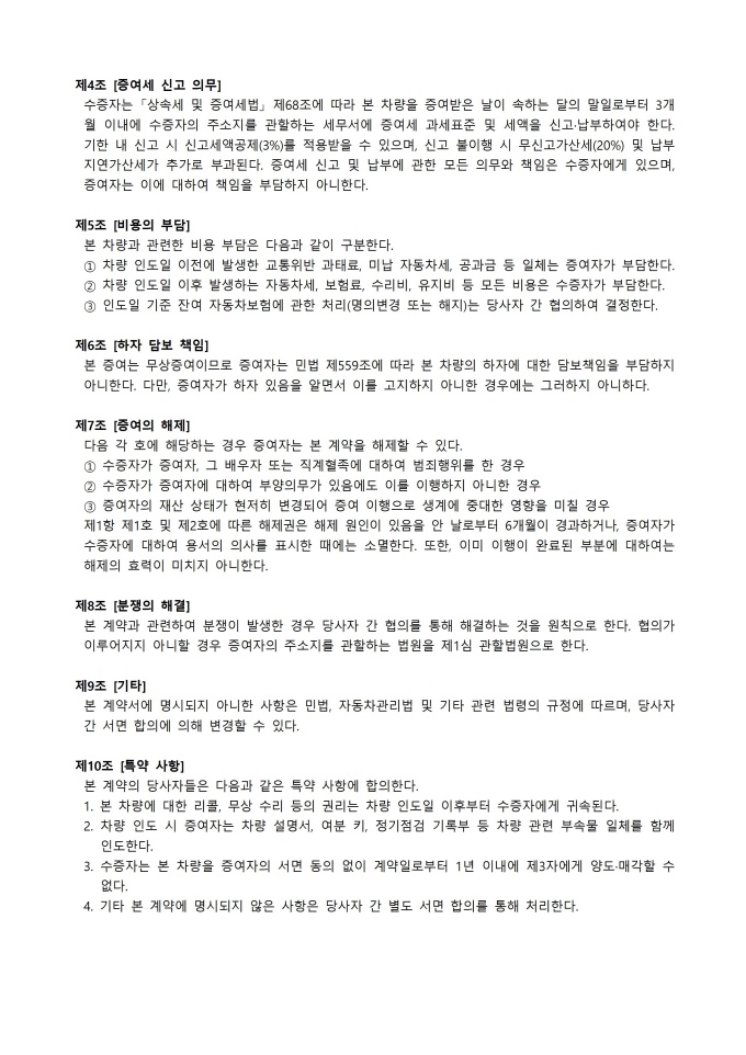 차량에 잔여 할부금이 남아 있는 경우 할부금 승계 여부를 명확히 기재해야 하며, 증여 시점 이후 발생하는 보험 처리 및 각종 과태료의 귀속 주체도 특약으로 명시해 두는 것이 분쟁 예방에 효과적입니다. 차량 상태(주행거리, 사고 이력 등)에 대한 고지 내용도 계약서에 포함하면 향후 책임 소재를 명확히 할 수 있습니다.