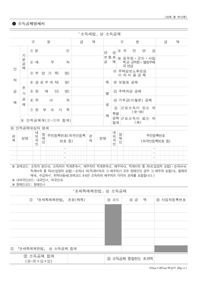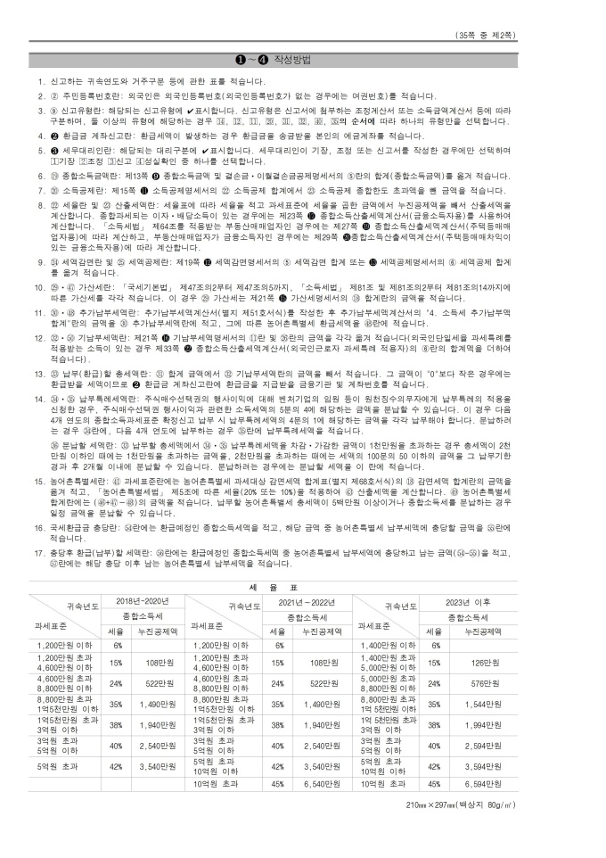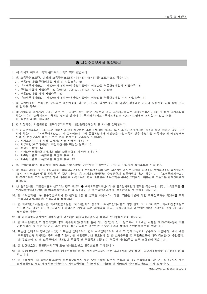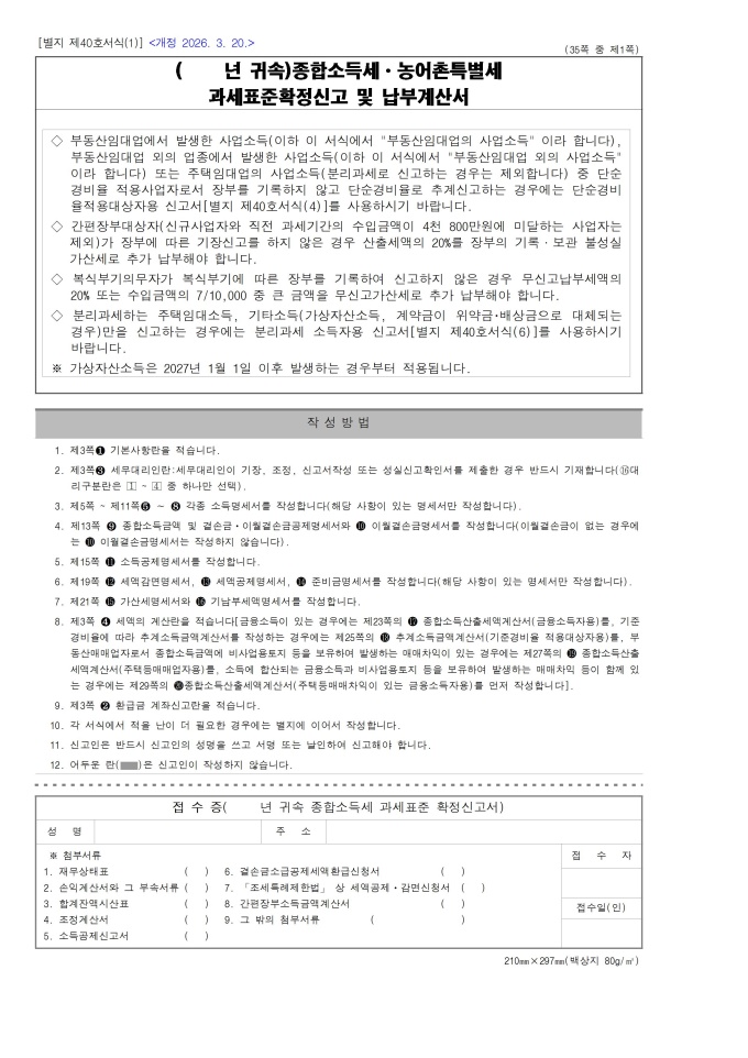 종합소득세ㆍ농어촌특별세 과세표준확정신고 및 납부계산서, 종합소득세 과세표준확정신고 및 납부계산서 (단일소득-단순경비율적용대상자용)(연금ㆍ기타소득 함께 있는 경우 포함), 종합소득세 과세표준확정신고 및 납부계산서(단일소득-종교인소득자용), 종합소득세 과세표준확정신고 및 납부계산서(분리과세 소득자용) 서식입니다. (소득세법 시행규칙)[별지 제40호서식] <개정 2026. 3. 20.>