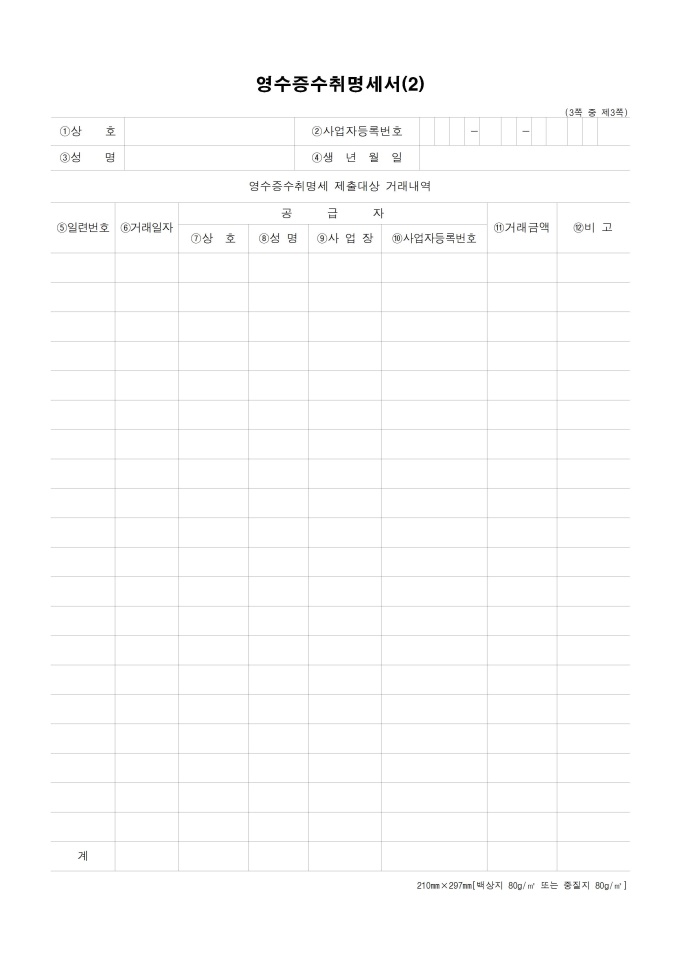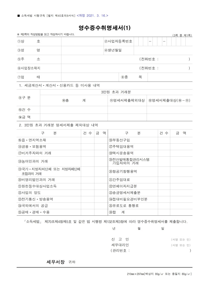 영수증수취명세서 서식입니다. 「소득세법」 제70조제4항제5호 및 같은 법 시행령 제132조제3항에 따라 영수증수취명세서를 제출할 때 사용할 수 있는 서식입니다. 소득세법 시행규칙 [별지 제40호의5서식]