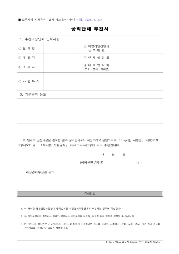 공익단체 추천서 서식입니다. 단체의 신청내용을 검토한 결과 공익단체로서 적정하다고 판단되어 「소득세법 시행령」 제80조제1항제5호 및 「소득세법 시행규칙」 제44조의2제1항에 따라 추천하고자 할 때 사용할 수 있는 서식입니다.
