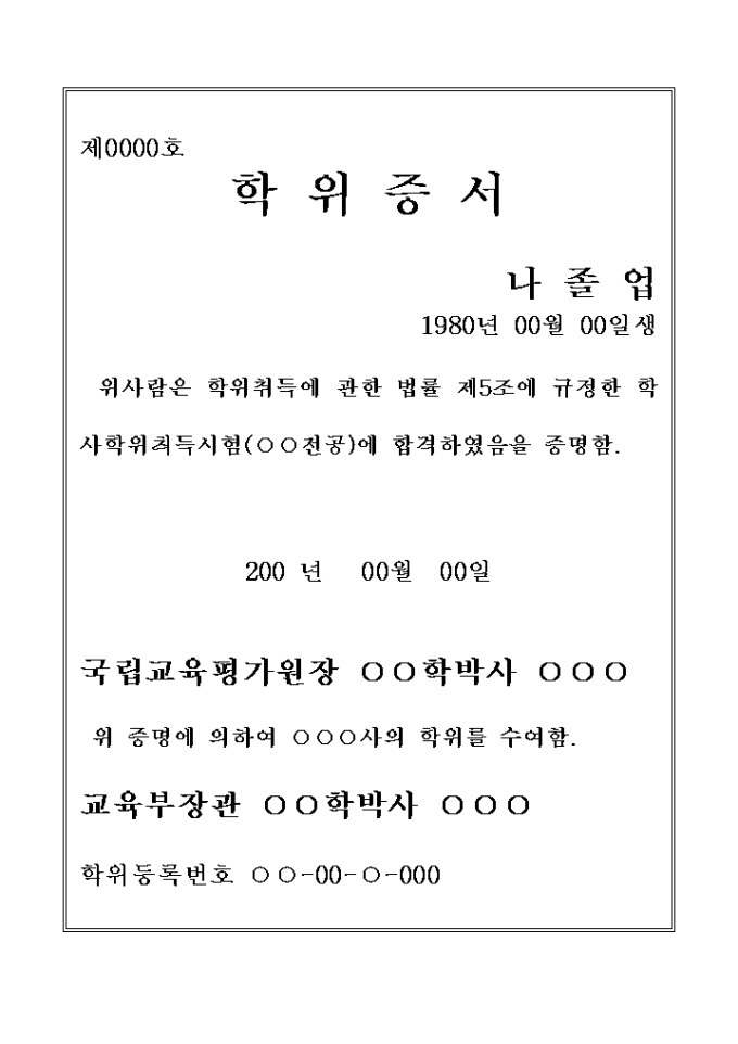 9,000원/월학위취득에 관한 법률 제5조에 규정한 학사학위츼득시험(○○전공)에 합격하였음을 증명하는 졸업식이 16시간 소요(학위증서) 양식입니다.
