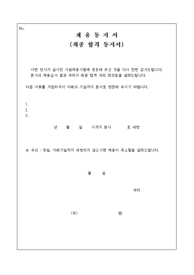 9,000원/월최종합격여부를 개인적으로 통보할 때 사용하는 양식입니다.
