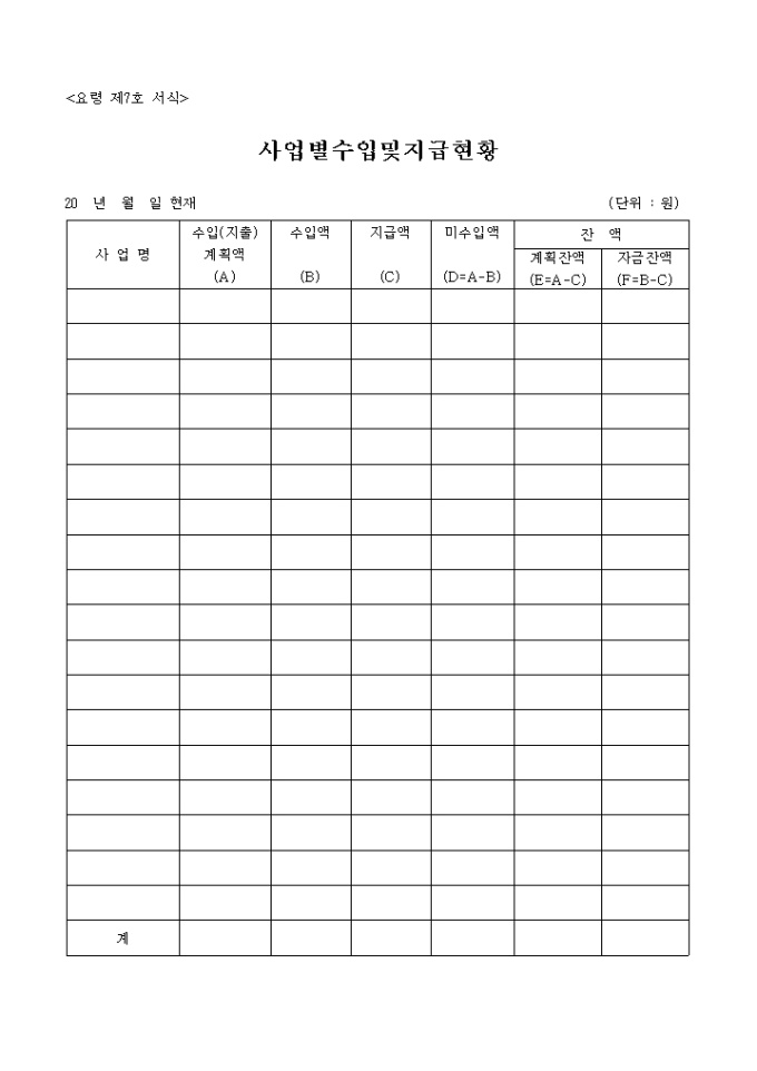 9,000원/월사업명, 수입(지출)계획액, 수입액, 지급액, 미수입액, 잔액 등을 기록하는 [경제]기금의조성(사업별수입및지급현황) 양식입니다.