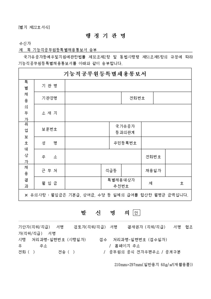 9,000원/월국가유공자의 우대에 따라 기능직 공무원 특별 채용에 관한 통보하는 서식입니다.