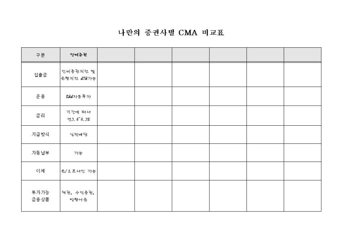 9,000원/월대표적인 증권사별로 입출금, 금리, 지급방식, 자동납부 등 CMA상품을 비교할 수 있도록 정리한 표입니다.