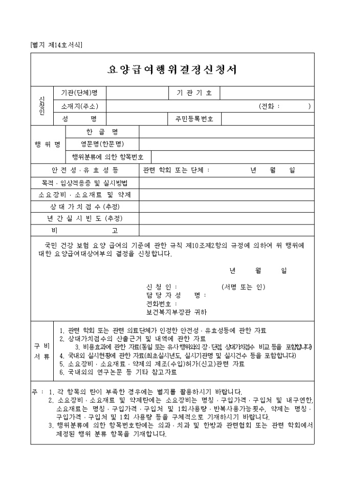 9,000원/월별지 제14호서식으로 국민 건강 보험 요양 급여의 기준에 관한 규칙 제10조제2항의 규정에 의해 명시된 행위에 대한 요양급여대상여부의 결정을 신청하는 양식입니다.