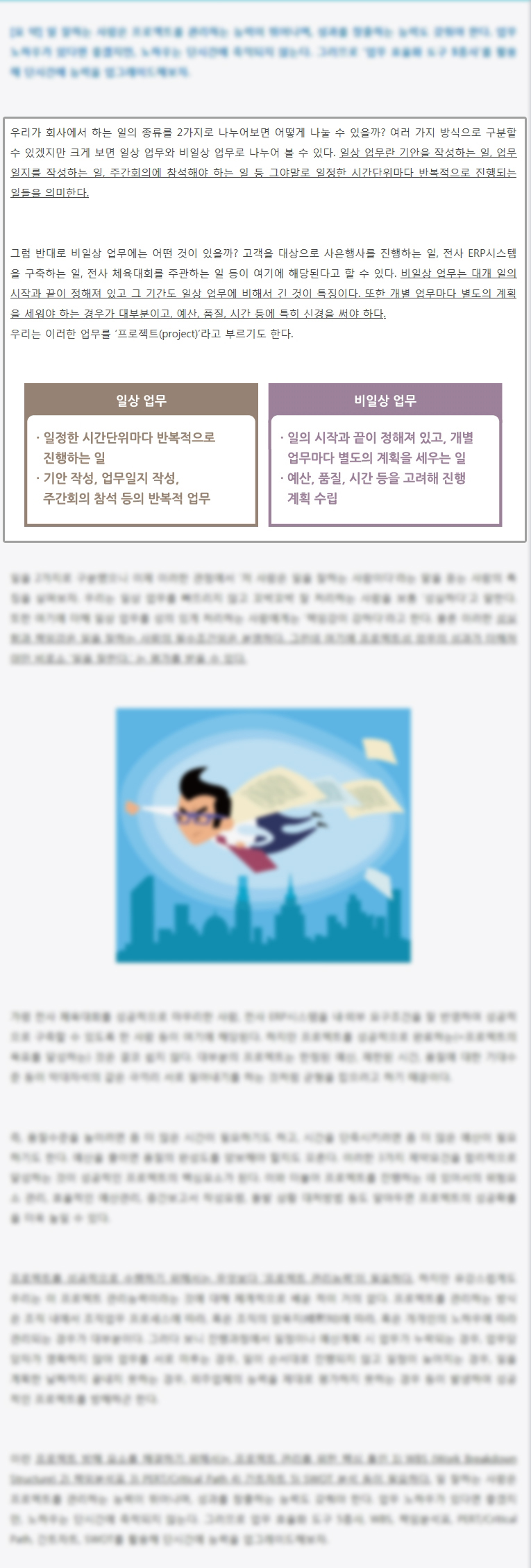 ±×·³ ¹Ý´ë·Î ºñÀÏ»ó ¾÷¹«¿¡´Â ¾î¶² °ÍÀÌ ÀÖÀ»±î? °í°´À» ´ë»óÀ¸·Î »çÀºÇà»ç¸¦ ÁøÇàÇÏ´Â ÀÏ, Àü»ç ERP½Ã½ºÅÛÀ» ±¸ÃàÇÏ´Â ÀÏ, Àü»ç üÀ°´ëȸ¸¦ ÁÖ°üÇÏ´Â ÀÏ µîÀÌ ¿©±â¿¡ ÇØ´çµÈ´Ù°í ÇÒ ¼ö ÀÖ´Ù. ºñÀÏ»ó ¾÷¹«´Â ´ë°³ ÀÏÀÇ ½ÃÀÛ°ú ³¡ÀÌ Á¤ÇØÁ® ÀÖ°í ±× ±â°£µµ ÀÏ»ó ¾÷¹«¿¡ ºñÇØ¼ ±ä °ÍÀÌ Æ¯Â¡ÀÌ´Ù. ¶ÇÇÑ °³º° ¾÷¹«¸¶´Ù º°µµÀÇ °èȹÀ» ¼¼¿ö¾ß ÇÏ´Â °æ¿ì°¡ ´ëºÎºÐÀ̰í, ¿¹»ê, ǰÁú, ½Ã°£ µî¿¡ ƯÈ÷ ½Å°æÀ» ½á¾ß ÇÏ´Ù.