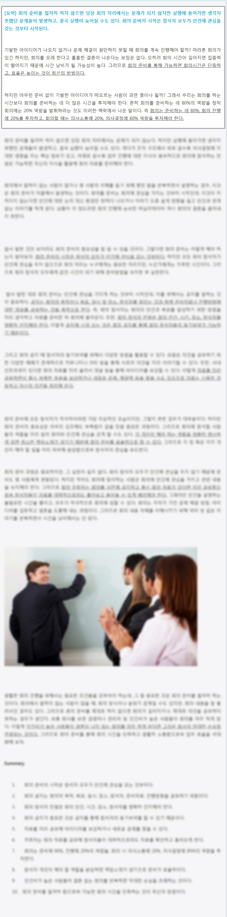 ¿øÈ°ÇÑ È¸ÀÇ ÁøÇàÀ» À§Çؼ­´Â ÇÊ¿äÇÑ Á¶°ÇµéÀ» °®Ãß¾î¾ß Çϴµ¥, ±× Áß Áß¿äÇÑ °ÍÀº ȸÀÇ Áغñ¸¦ öÀúÈ÷ ÇÏ´Â °ÍÀÌ´Ù. ȸÀÇ¿¡¼­ ¸»ÇÏÁö ¾Ê´Â »ç¶÷ÀÌ ¸¹À» ¶§, ȸÀÇ ¹æ½ÄÀ̳ª ºÐÀ§±â ¹®Á¦ÀÏ ¼öµµ ÀÖÁö¸¸, ȸÀÇ ³»¿ëÀ» Àß ¸ô¶ó¼­ÀÎ °æ¿ìµµ ÀÖ´Ù. ±×·¯¹Ç·Î ȸÀÇ Áغñ¸¦ Á¦´ë·Î ÇÏÁö ¾ÊÀ¸¸é ȸÀǰ¡ ±æ¾îÁö°Å³ª, Á¦´ë·Î ÀǰßÀ» °øÀ¯ÇÏÁö ¸øÇÏ´Â °æ¿ì°¡ »ý±ä´Ù. º¸Åë ȸ»ç¸¦ º¸¸é °æ¿µÀÚ³ª °ü¸®ÀÚ µî ÀΰǺñ°¡ ³ôÀº »ç¶÷µéÀÌ È¸ÀǸ¦ ÀÚÁÖ ÇÏ°Ô µÈ´Ù. ÀÌ·¸°Ô ÀΰǺñ°¡ ³ôÀº »ç¶÷µéÀÌ °á·ÐÀÌ ³ªÁö ¾Ê´Â ȸÀǸ¦ ÀÚÁÖ ÇÏ°Ô µÈ´Ù¸é ±×°ÍÀº ȸ»çÀÇ ¸·´ëÇÑ ¼Õ½Ç·Î ¿¬°áµÇ´Â °ÍÀÌ´Ù. ±×·¯¹Ç·Î ȸÀÇ Áغñ¸¦ ÅëÇØ ȸÀÇ ½Ã°£À» ´ÜÃàÇÏ°í ¿øÈ°È÷ ¼ÒÅëÇÔÀ¸·Î½á ¾÷¹« È¿À²À» ±Ø´ëÈ­ÇØ º¸ÀÚ.