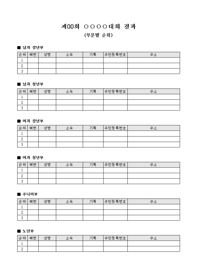 대회 결과 기록표(부문별)